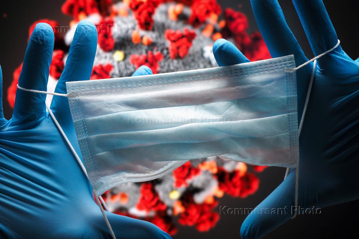 Genre photo. Face mask with the coronavirus model in the background.