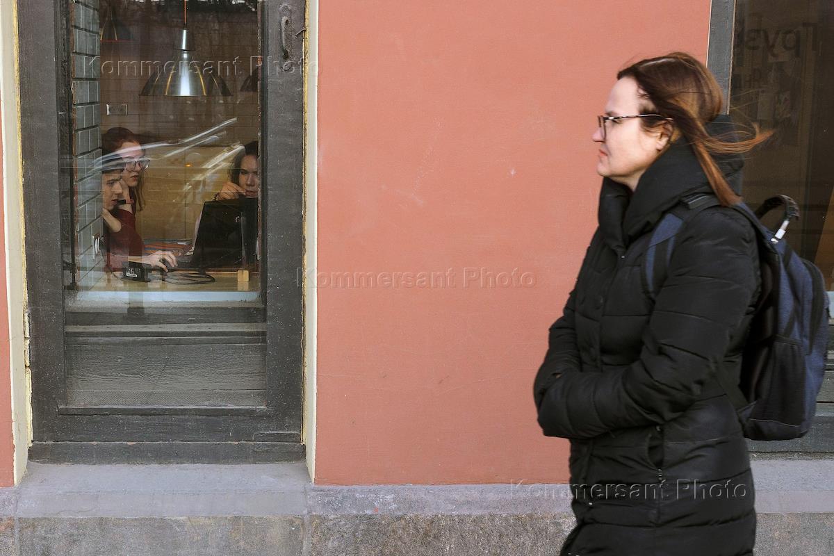 Genre photo. Woman walks past a coffee house.