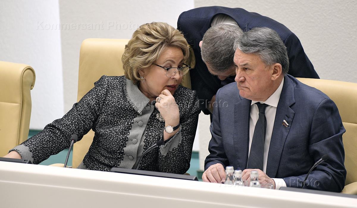 Заседание Совета Федерации (СФ) России. Председателья СФ России Валентина Матвиенко (слева) и заместитель председателя СФ России Юрий Воробьев (справа) во время заседания.