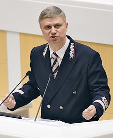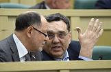 Заседание Совета Федерации (СФ) России. Представитель в СФ России от исполнительного органа государственной власти Ивановской области Валерий Васильев (слева) и представитель в Совете Федерации от исполнительного органа государственной власти Калининградской области Олег Ткач (справа) во время заседания.