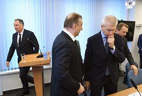 Заседание Исполкома Олимпийского комитета России. Министр спорта России Олег Матыцин (второй слева), президент Олимпийского комитета России (ОКР) Станислав Поздняков (в центре) и вице-президент ОКР, президент Федерации спортивной гимнастики России Василий Титов (справа) перед началом заседания.