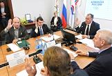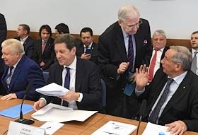 Заседание Исполкома Олимпийского комитета России. Член комитета Совета Федерации России по международным делам, представитель в Совете Федерации России от законодательного органа Ростовской области Леонид Тягачев (слева), первый заместитель председателя Государственной думы России Александр Жуков (второй слева) и президент Федерации тенниса России Шамиль Тарпищев (справа) во время заседания.