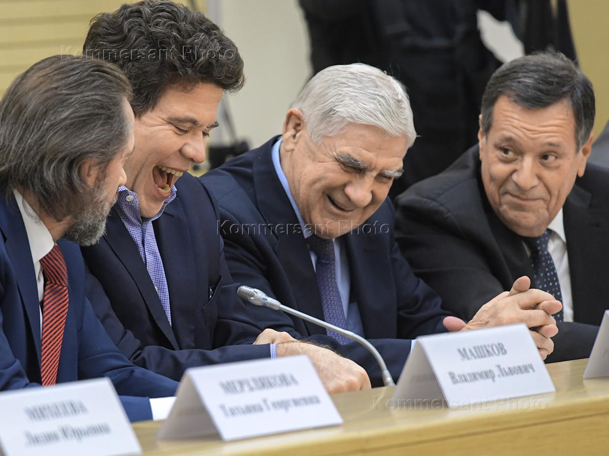 Встреча президента России Владимир Путина с рабочей группой по подготовке предложений о внесении поправок в Конституцию России прошла в резиденции Ново-Огарево. Слева направо: художественный руководитель театра-студии Олега Табакова Владимир Машков, заведующий кафедров теории государства и права и политологии юридического факультета Московского государственного универститета (МГУ) имени М.В.Ломоносова Михаил Марченко, председатель комитета Государственной думы (ГД) России по бюджету и налогам Андрей Макаров, член комитета ГД России по делам национальностей Григорий Ледков и представитель в Совете Федерации России от законодательного (представительного) органа государственной власти Брянской области Екатерина Лахова перед началом встречи.