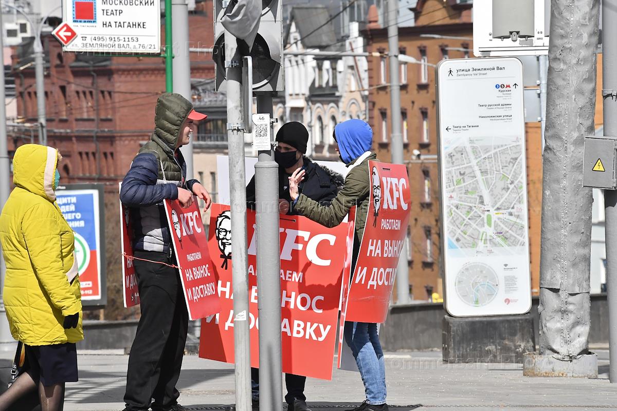 Москва во время режима самоизоляции из-за опасности распространения коронавирусной инфекции COVID-19. Жанровая фотография. Рекламные щиты ресторана быстрого питания KFC надетые на молодых людей.