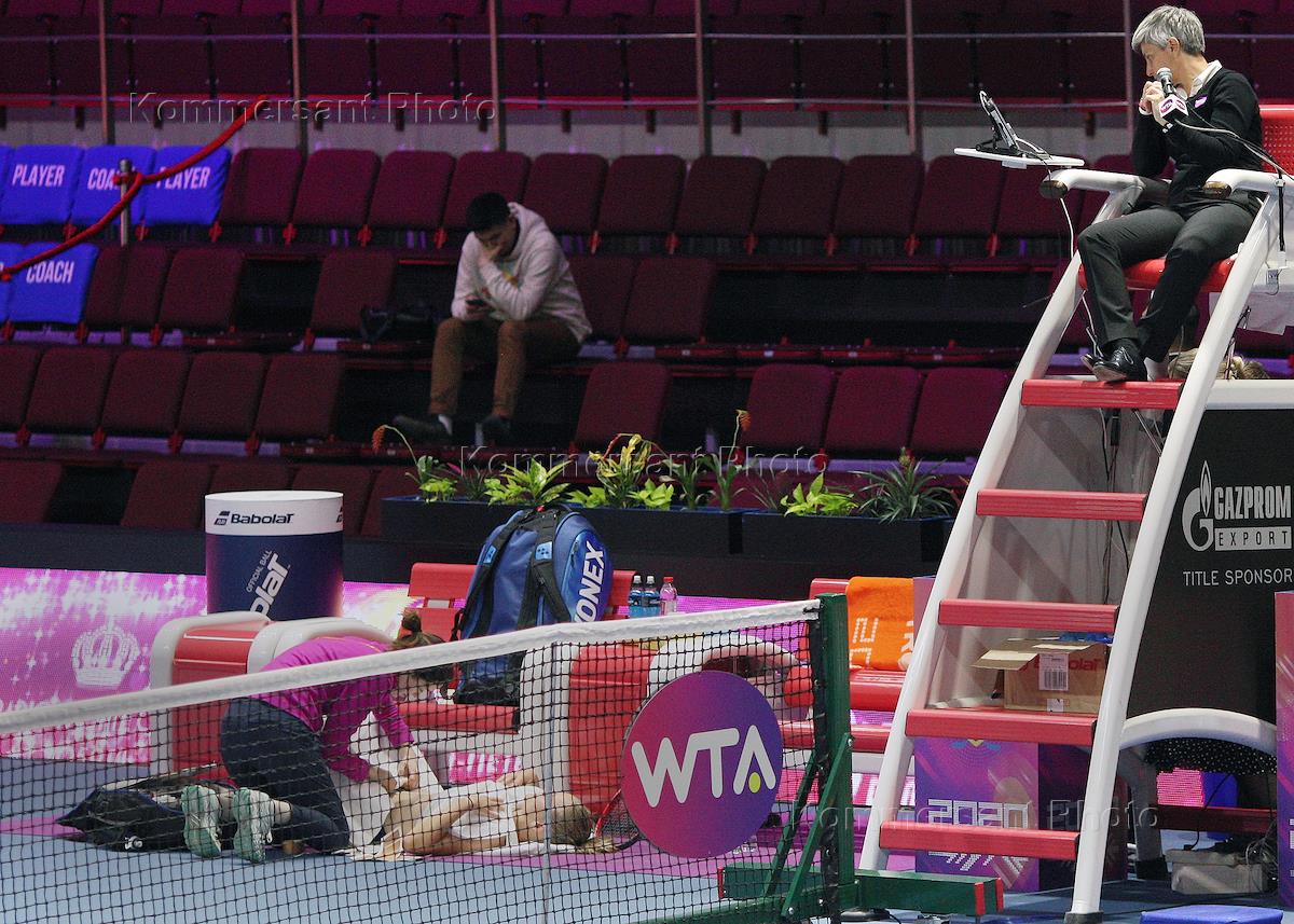 V Международный теннисный турнир "WTA St. Petersburg Ladies Trophy 2020" на стадионе "Сибур Арена". Французской теннисистке Фионе Ферро во время матча второго круга с казахстанской теннисисткой Еленой Рыбакиной оказывают медицинскую помощь.