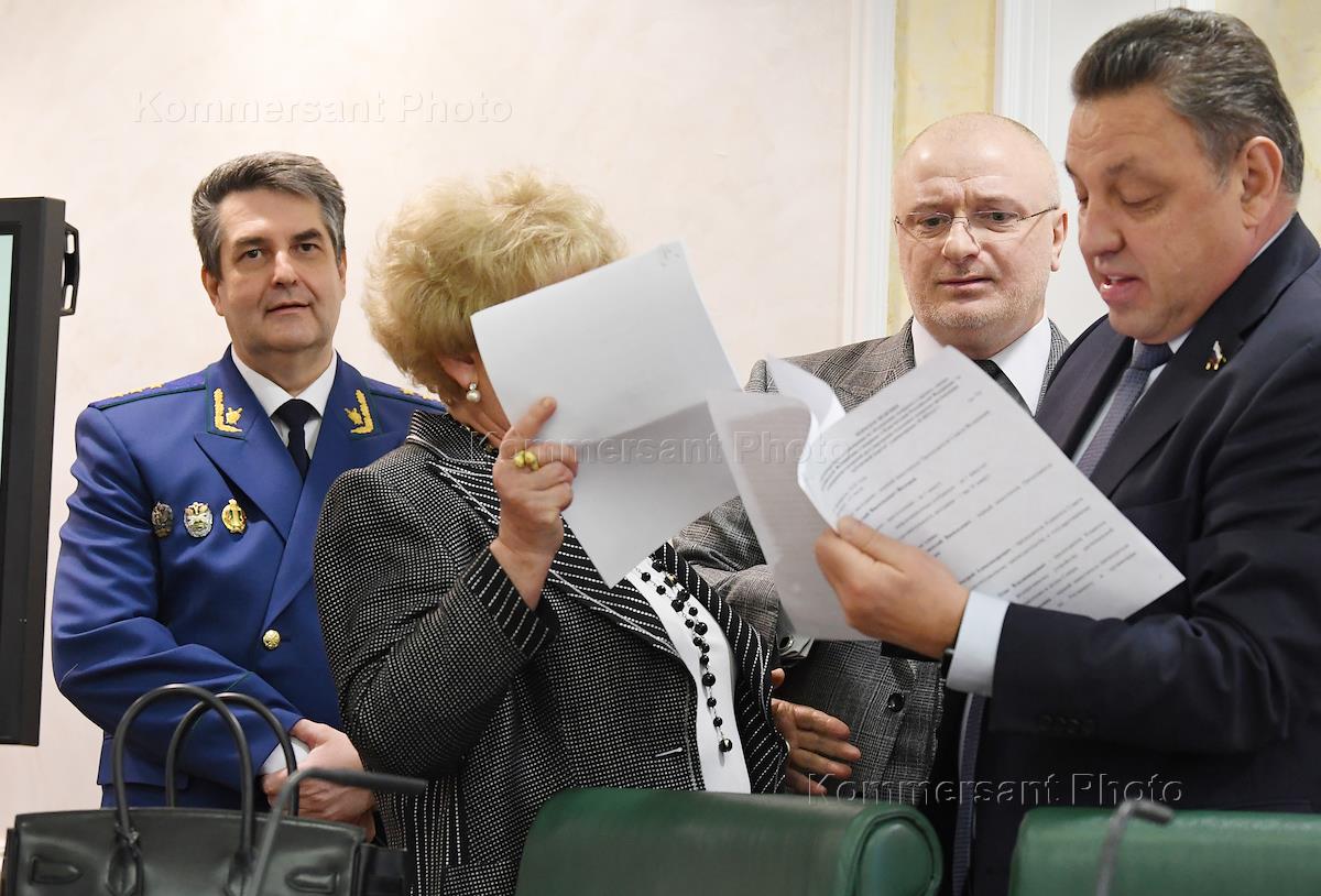 Расширенное совещание по обсуждению проекта закона о поправке к Конституции России "О совершенствовании регулирования отдельных вопросов организации публичной власти" (законопроект № 885214–7) в Совете Федерации (СФ) России. Справа налево: представитель в СФ России от исполнительного органа государственной власти Кировской области Вячеслав Тимченко, председатель комитета СФ России по конституционному законодательству и государственному строительству Андрей Клишас, представитель в СФ России от исполнительного органа государственной власти Республики Тыва Людмила Нарусова и заместитель генерального прокурора России Николай Винниченко перед началом заседания.