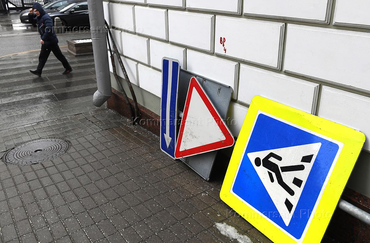 Жанровая фотография. Знаки дорожного движения лежат на тротуаре.