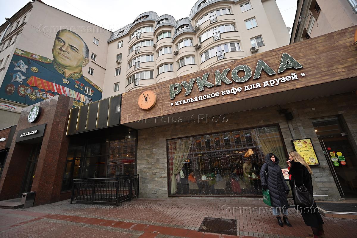 Жанровая фотография. Здание ресторана "Руккола" на улице Старый Арбат. Граффити с портетом маршала Геогрия Жукова на стене жилого здания.