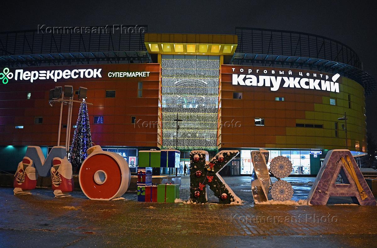 Жанровая фотография. Новогоднее оформление города. Торговый центр "Калужский". Надпись "Москва".