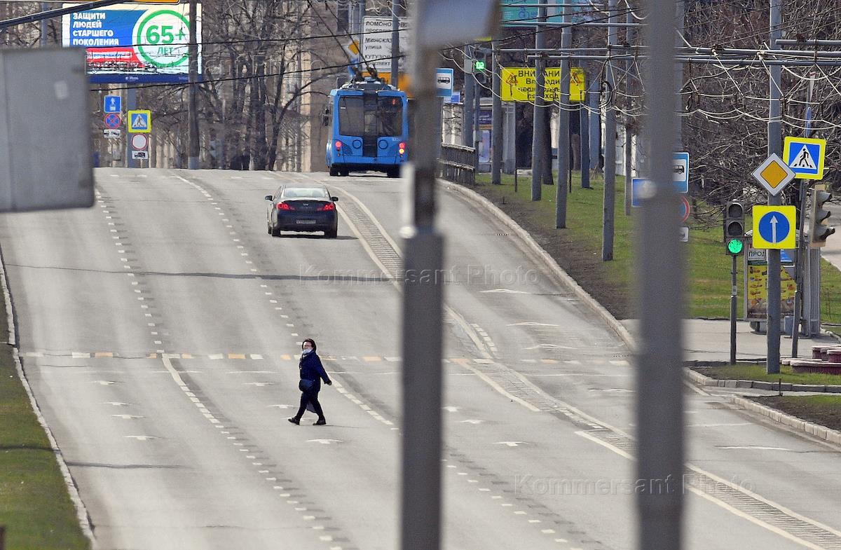 Виды Москвы во время режима самоизоляции из-за опасности распространения коронавирусной инфекции COVID-19. Жанровая фотография. Женщина в медицинской маске переходит улицу.
