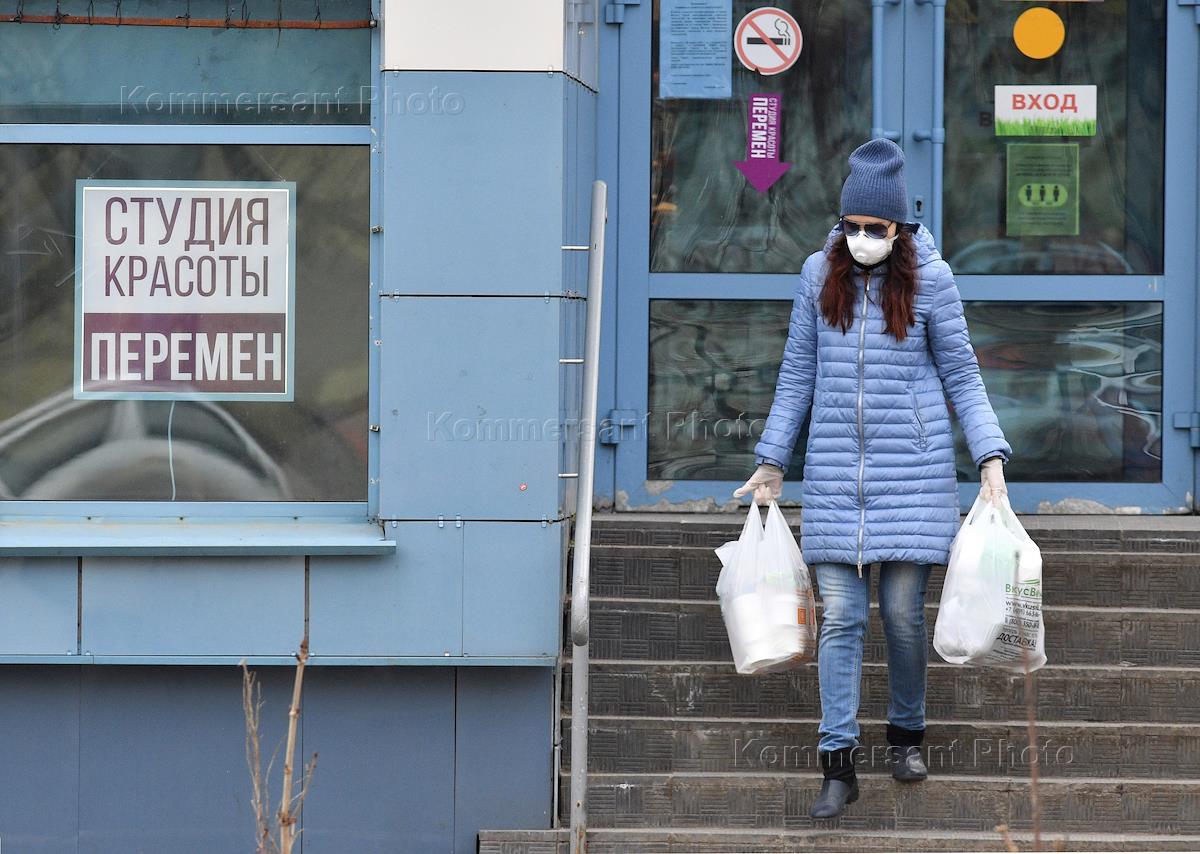 Виды Москвы во время режима самоизоляции из-за опасности распространения коронавирусной инфекции COVID-19. Жанровая фотография. Женщина в маске-респираторе с продуктами выходит из магазина "ВкусВилл".