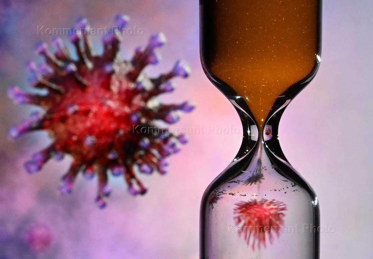 Режим самоизоляции из-за угрозы распространения коронавирусной инфекции COVID-19. Жанровая фотография. Песочные часы и модель молекулы COVID-19 на экране ноутбука.