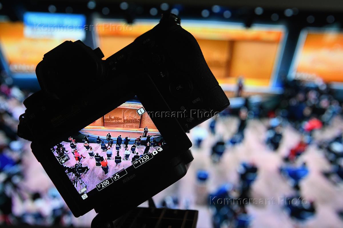 Жанровая фотография. Трансляция ежегодной пресс-конференции президента России Владимира Путина.
