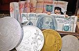 Жанровая фотография. Увеличенные модели денежных купюр и монет для фотосъемки.