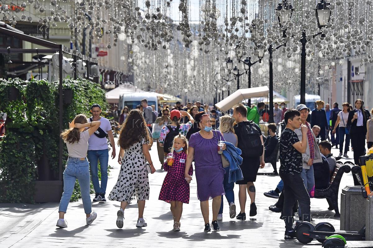Genre photo. Passers-by walk along Nikolskaya Street.