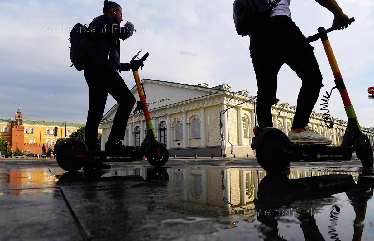 Жанровая фотография. Молодые люди на самокатах едут по Манежной площади.