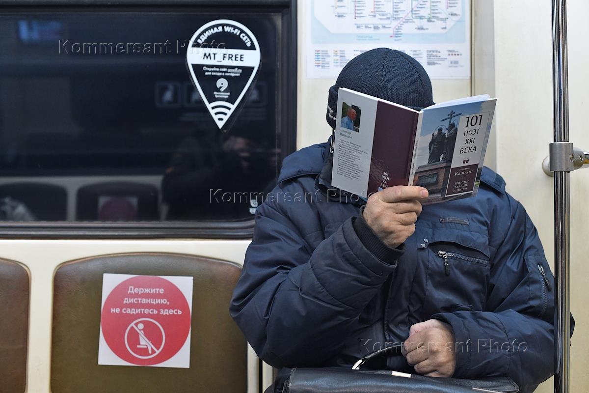 Жанровая фотография. Пассажир в вагоне поезда метро читает книгу "101 поэт XXI века".