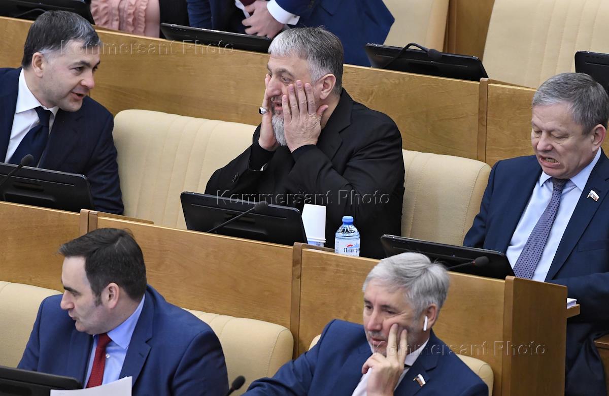 Пленарное заседание Государственной думы (ГД) России. Слева направо: член комитета ГД России по обороне Иван Тетерин, член комитета ГД России Юрий Левицкий и член комитета ГД России по энергетике Абдулгамид Эмиргамзаев перед началом заседания.