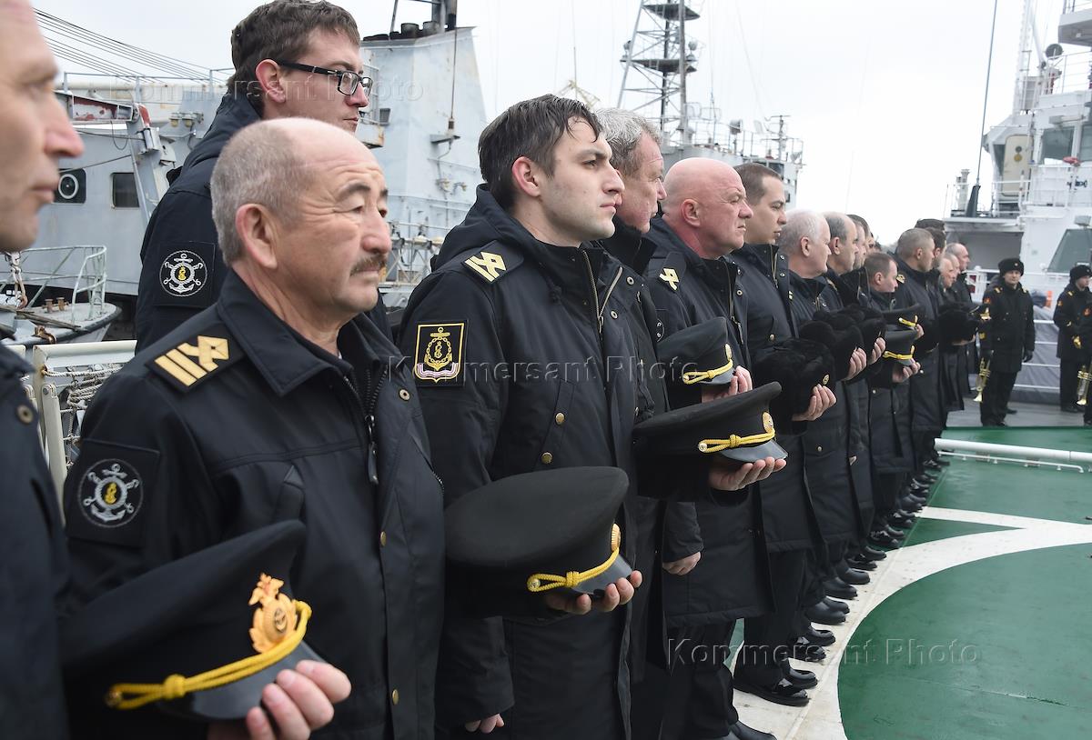 Церемония принятия в состав отряда судов обеспечения вспомогательного флота морского буксира "Сергей Балк". Экипаж буксира во время церемонии подъема Андреевского флага.