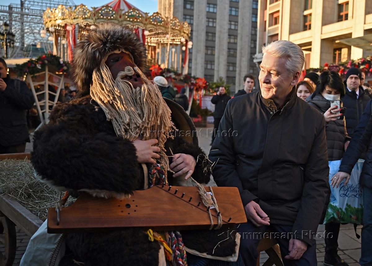 Церемония открытия гастрономического фестиваля "Московская Масленица" на Манежной площади. Мэр Москвы Сергей Собянин (слева) во время церемонии.