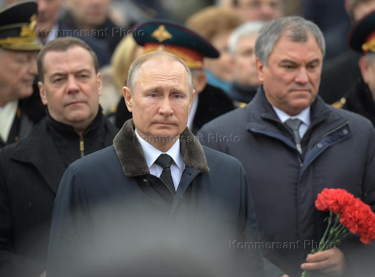 Церемония возложения венков к Могиле Неизвестного Солдата в честь Дня защитника Отечества. Слева направо: заместитель председателя Совета Безопасности России, председатель партии "Единая Россия" Дмитрий Медведев, президент России Владимир Путин и председатель Государственной думы России Вячеслав Володин во время церемонии.