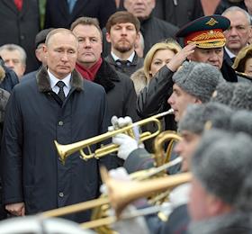 Церемония возложения венков к Могиле Неизвестного Солдата в честь Дня защитника Отечества. Президент России Владимир Путин (в центре) во время церемонии.