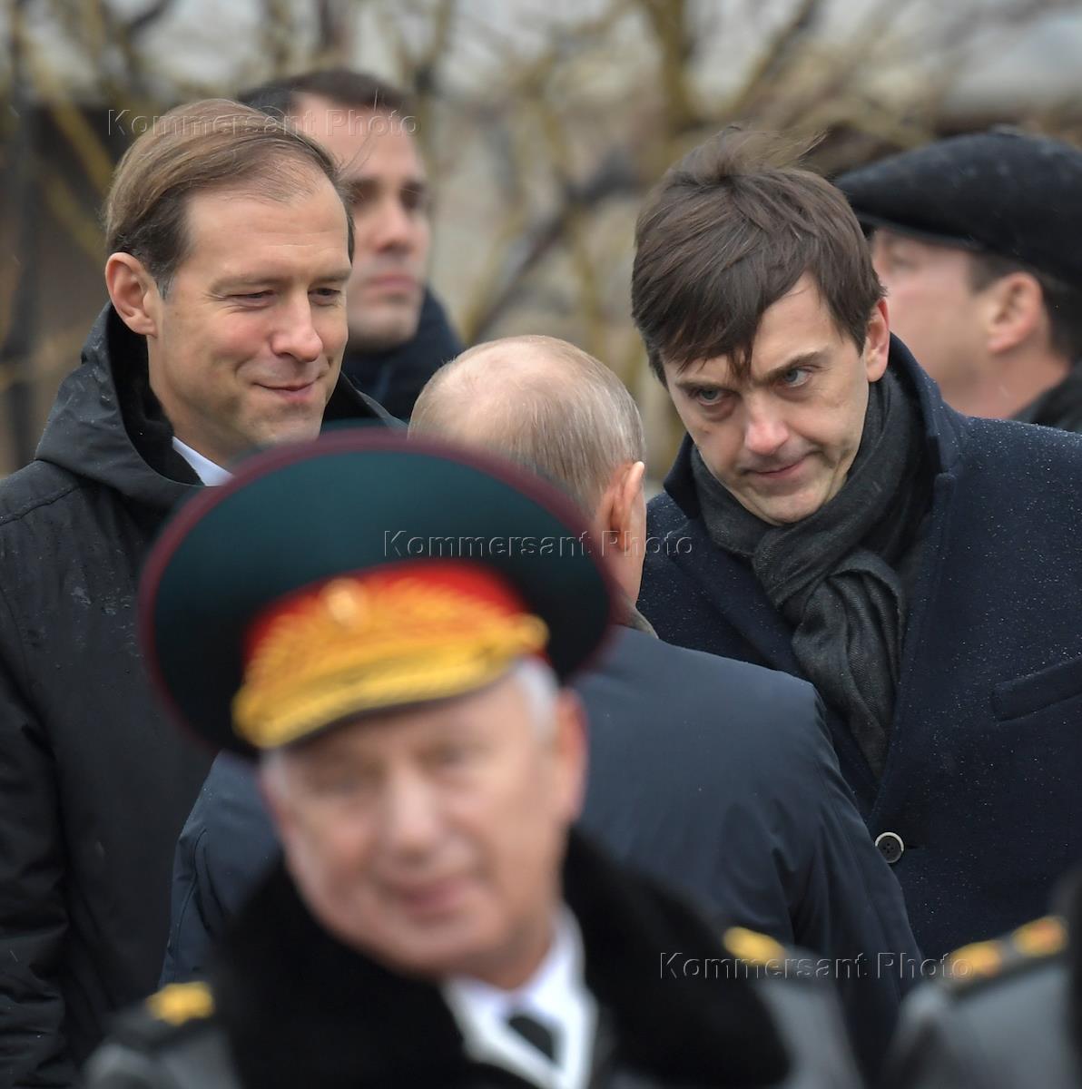 Церемония возложения венков к Могиле Неизвестного Солдата в честь Дня защитника Отечества. Министр промышленности и торговли России Денис Мантуров (слева) и министр просвещения России Сергей Кравцов (справа) во время церемонии.