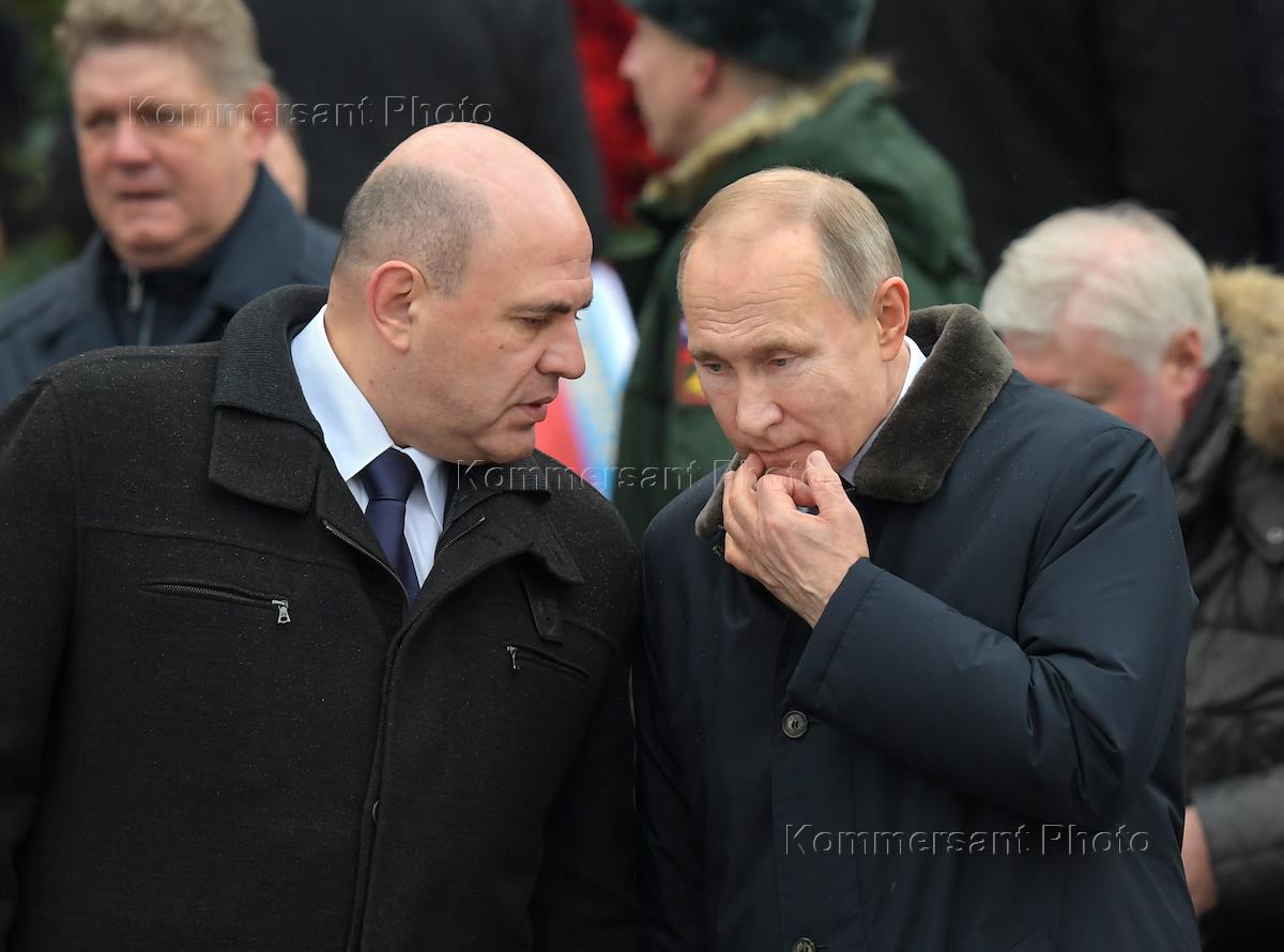 Церемония возложения венков к Могиле Неизвестного Солдата в честь Дня защитника Отечества. Председатель правительства России Михаил Мишустин (слева) и президент России Владимир Путин (справа) во время церемонии.