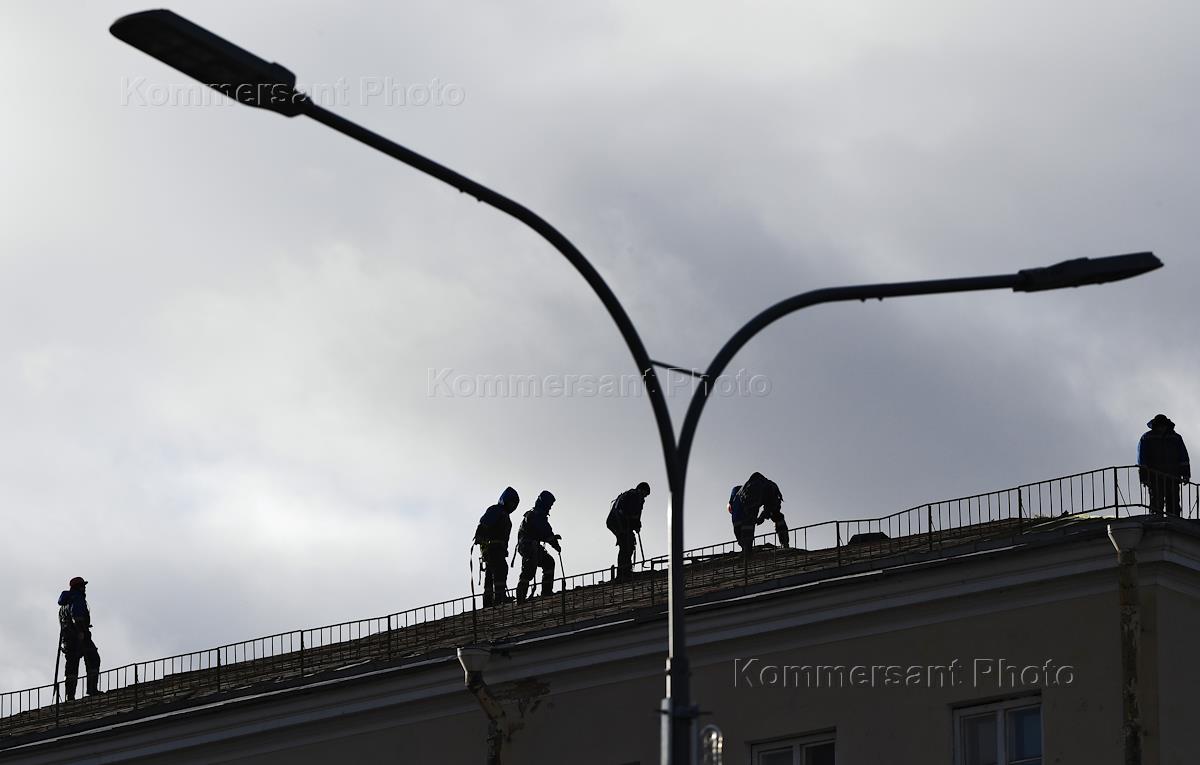 Genre photo. Municipal workers cleaning the roof.
