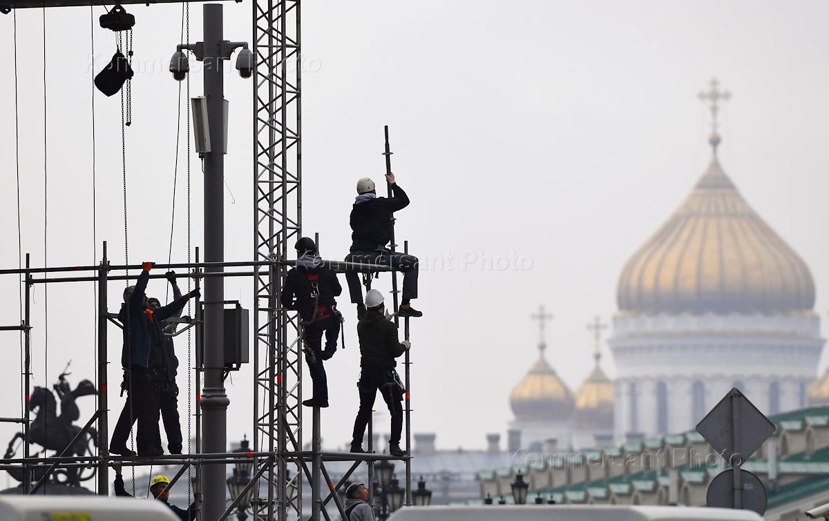 Moscow scenery. Genre photography. Industrial climbers on a construction cradle during the renovation of the facade of a building.