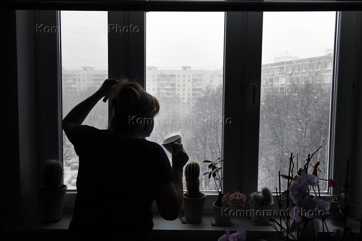 Жанровая фотография. Женщина у окна смотрит на снегопад.
