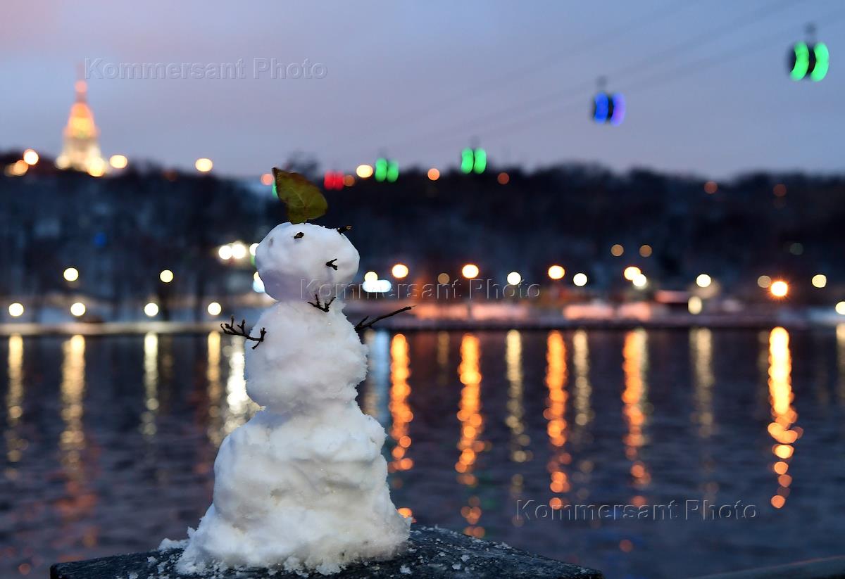 Виды Москвы. Жанровая фотография. Фигура снеговика на набережной Москвы-реки.