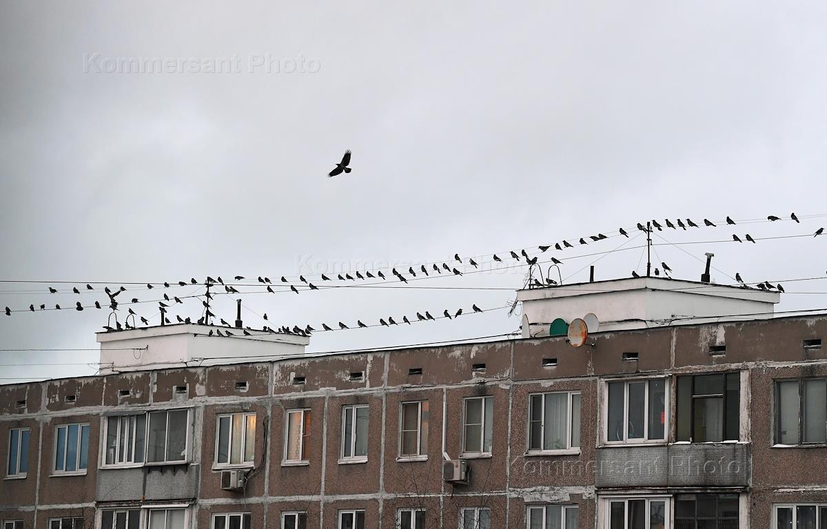 Виды Москвы. Жанровая фотография. Стая ворон, сидящих на проводах над жилым домом.
