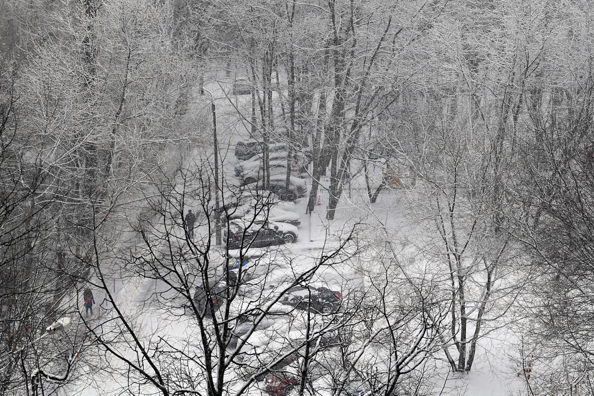Виды Москвы во время карантина коронавируса COVID-19. Снегопад в городе. Жанровая фотография. Автомобили на парковке во дворе жилого дома.