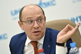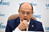 Пресс-коференция руководства Российской Премьер-Лиги (РПЛ), посвященная старту весенней части РПЛ сезона 2019-2020 годов и подписанию договора с титульным спонсором РПЛ Группой "Тинькофф", в агенстве "Интерфакс". Президент РПЛ Сергей Прядкин во время пресс-конференции.
