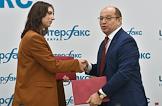 Пресс-коференция руководства Российской Премьер-Лиги (РПЛ), посвященная старту весенней части РПЛ сезона 2019-2020 годов и подписанию договора с титульным спонсором РПЛ Группой "Тинькофф", в агенстве "Интерфакс". Президент РПЛ Сергей Прядкин (справа) и вице-президент банка "Тинькофф" Анна Михина (слева) во время церемонии подписания договора.