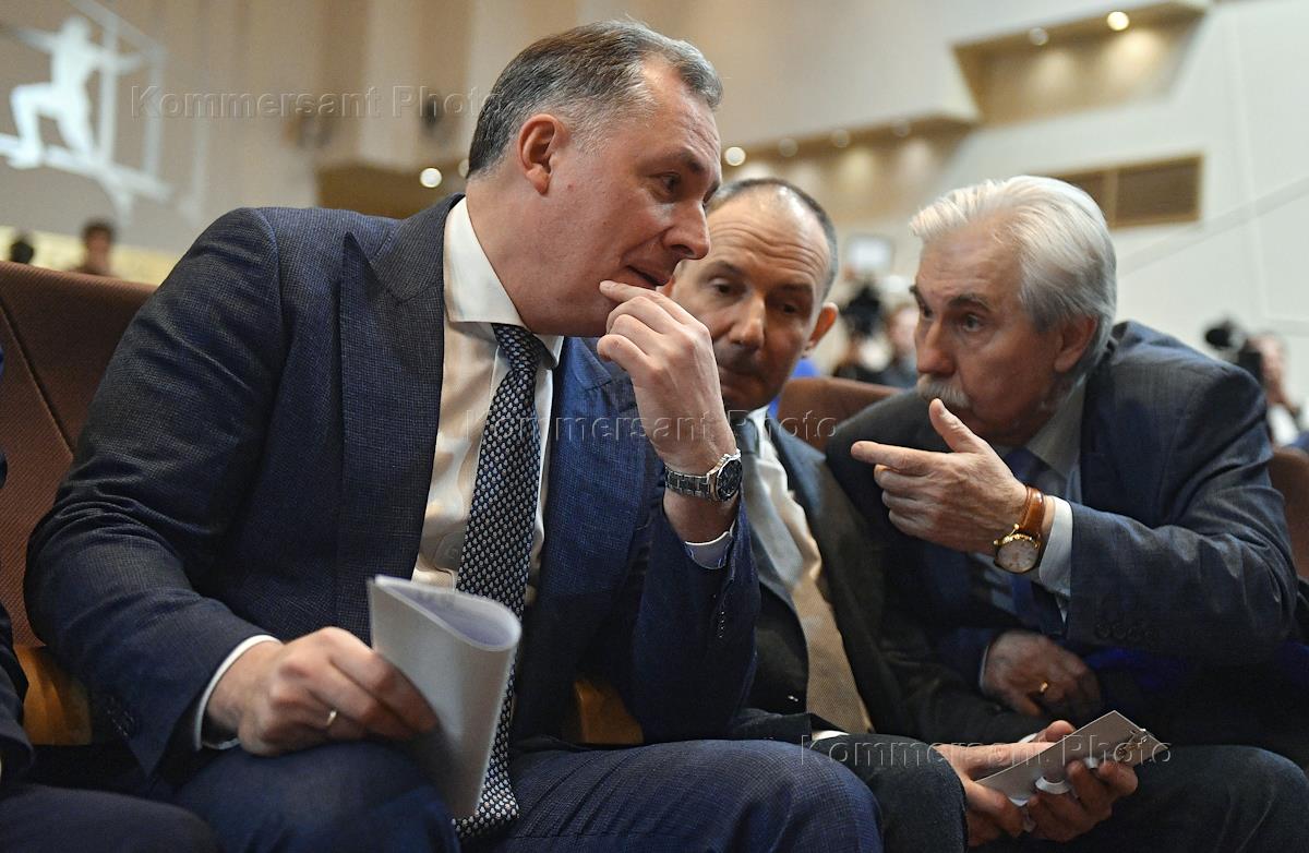 Внеочередная выборная конференция Всероссийской федерации легкой атлетики (ВФЛА). Президент Олимпийского комитета России Станислав Поздняков (слева) во время конференции.