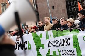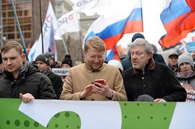 Марш памяти политика Бориса Немцова от Страстного бульвара до проспекта Академика Сахарова. Депутат Московской городской думы Максим Круглов (слева), заместитель председателя партии "Яблоко" Николай Рыбаков (в центре) и председатель федерального политкомитета партии "Яблоко" Григорий Явлинский (справа) во время марша.