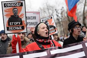 Марш памяти политика Бориса Немцова от Страстного бульвара до проспекта Академика Сахарова. Участники марша. Плакат "Свободу Егору Лесных!".