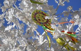 Празднование "Широкой Масленицы" на ВДНХ. Маска-Солнце на искусственном дереве.