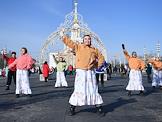 Празднование "Широкой Масленицы" на ВДНХ. Участники празднования с ленточной каруселью.