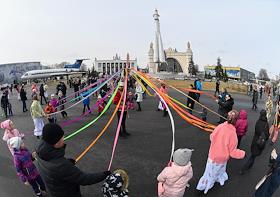 Празднование "Широкой Масленицы" на ВДНХ. Дети с ленточной каруселью.