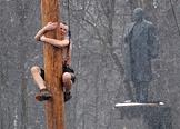 Празднование "Широкой Масленицы" на Софийской набережной. Мужчина на масленичном столбе на фоне памятника В.И. Ленину.