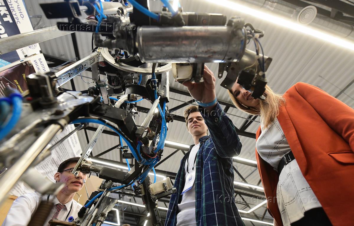 XVI Балтийский научно-инженерный конкурс - крупнейший смотр научных работ школьников России. Выставка проектов и работ участников конкурса. Участник из Казахстана Рахат Жакиенов (в центре) на выставке со своим проектом ракеты модельного масштаба RCS-1E.