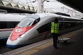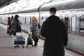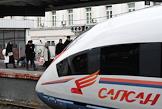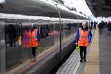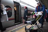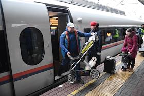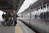 Церемония встречи 40-миллионного пассажира высокоскоростного поезда "Сапсан" на Ленинградском вокзале. Пассажиры на платформе.