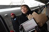 Церемония встречи 40-миллионного пассажира высокоскоростного поезда "Сапсан" на Ленинградском вокзале. Жительница Санкт-Петербурга Наталья Евграфова (в центре), получившая сертификат 40-миллионного пассажира во время церемонии.