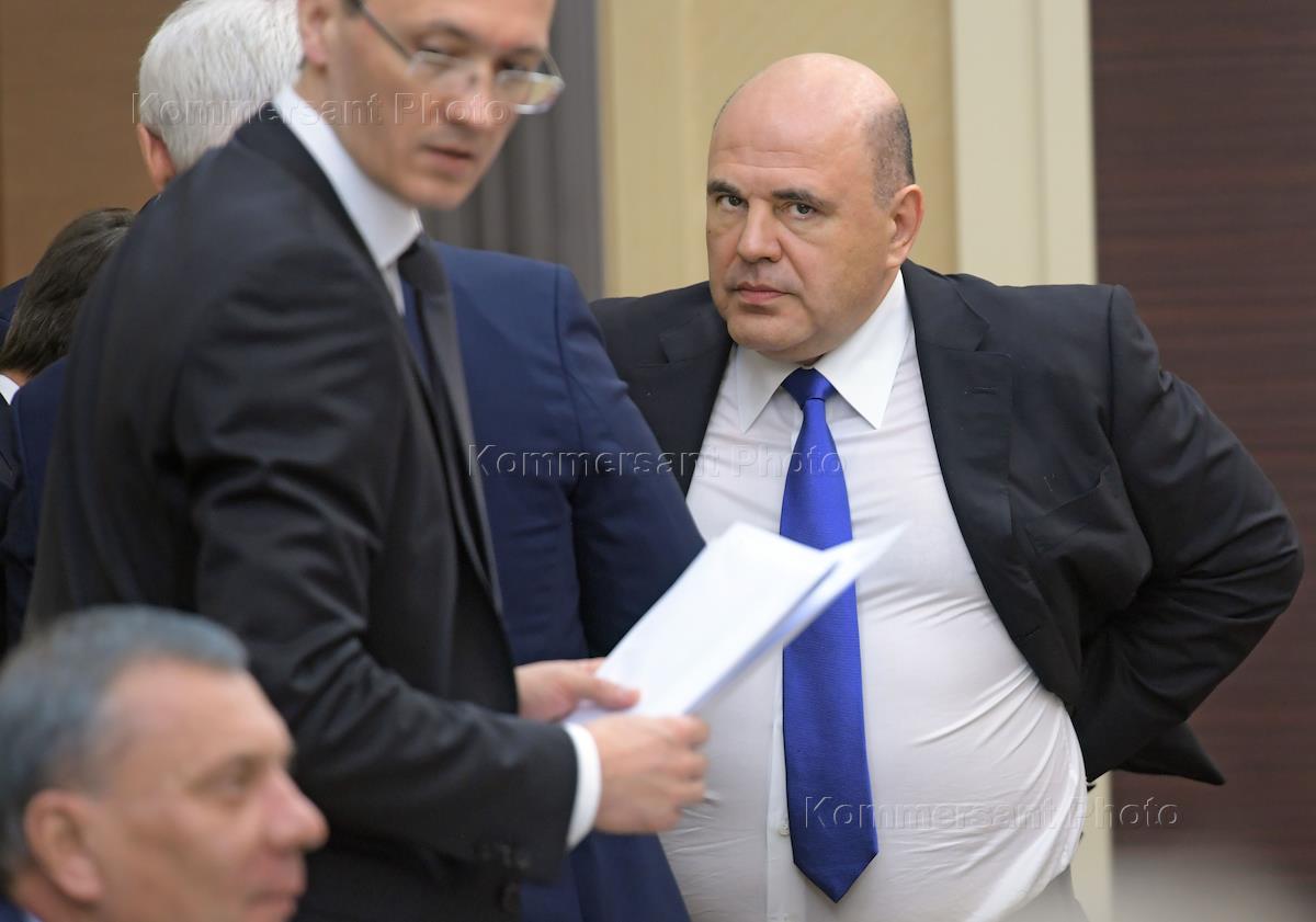 Совещание президента России Владимир Путин с членами правительства России в резиденции Ново-Огарево. Заместитель председателя правительства России - руководитель аппарата правительства России Дмитрий Григоренко (слева) и председатель Правительства России Михаил Мишустин (справа) перед началом совещания.