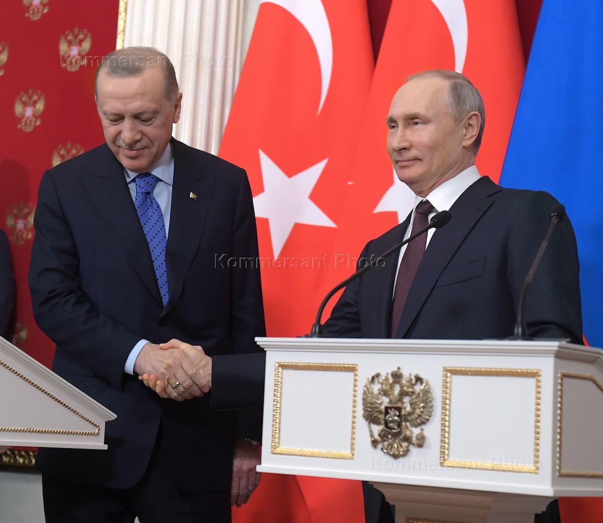 Президент Турецкой Республики Реджеп Тайип Эрдоган (справа) во время переговоров c президентом России Владимиром Путиным в Кремле.