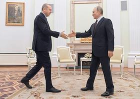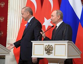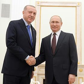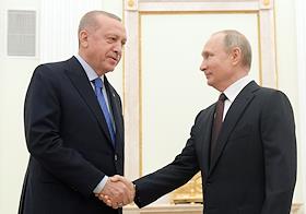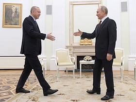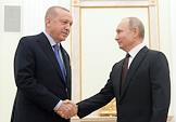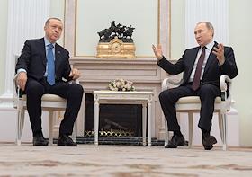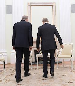 Президент Турецкой Республики Реджеп Тайип Эрдоган (справа) во время переговоров c президентом России Владимиром Путиным в Кремле.