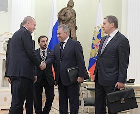 Президент Турецкой Республики Реджеп Тайип Эрдоган (слева), министр обороны России Сергей Шойгу (в центре) и помощник президента России Юрий Ушаков (справа) во время переговоров президента России Владимира Путина и президента Турецкой Республики Реджепа Тайипа Эрдогана в Кремле.